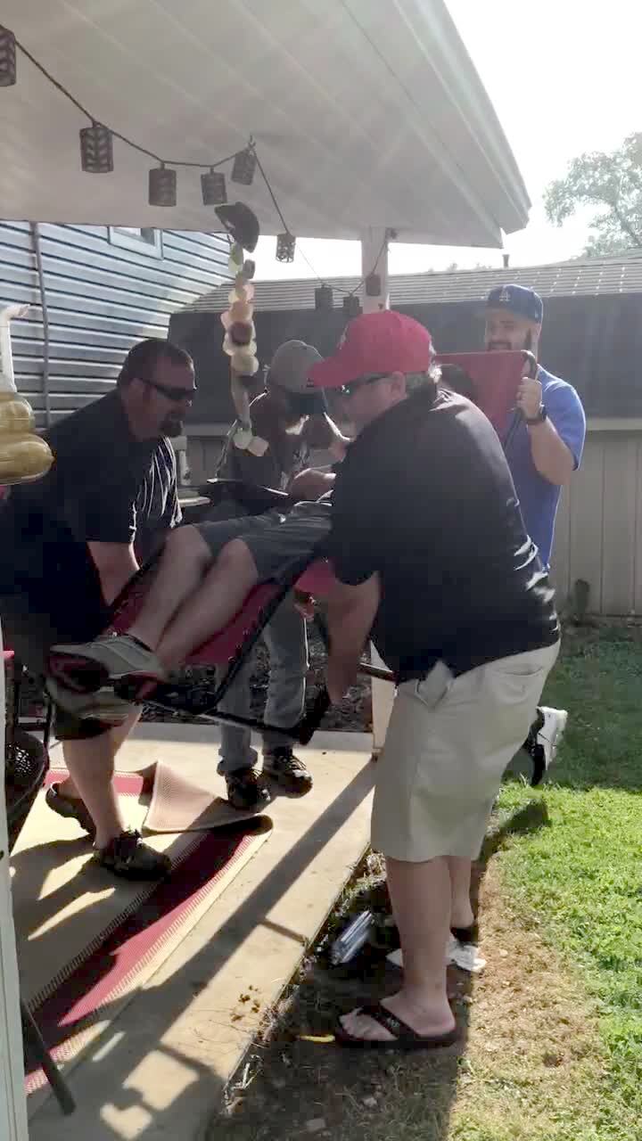 A small Chihuahua puppy dog runs around a man's head and neck while he sits in a living room chair. Featured talent cleared (the man).