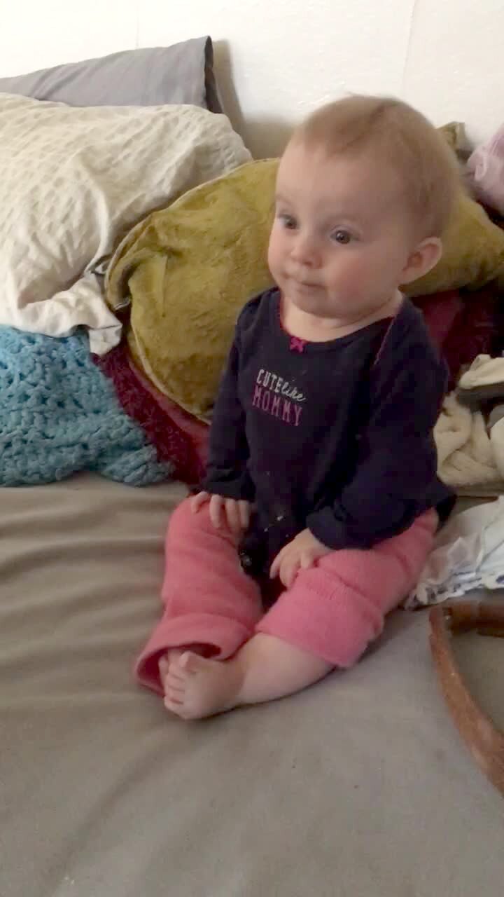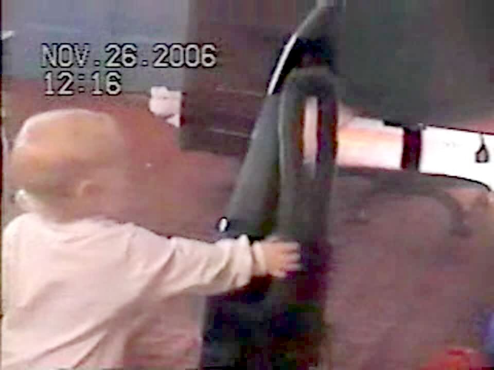 Baby girl plays with vacuum and accidentally turns it on. Baby gets scared & crawls away quickly.