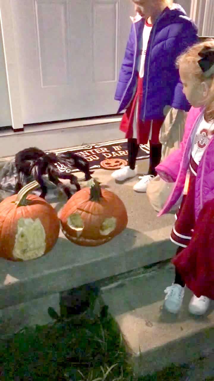 Two young girls try to get a spider decoration to move but it won't. Their tot sister steps near the spider and it jumps towards her. The tot girl screams and shakes.