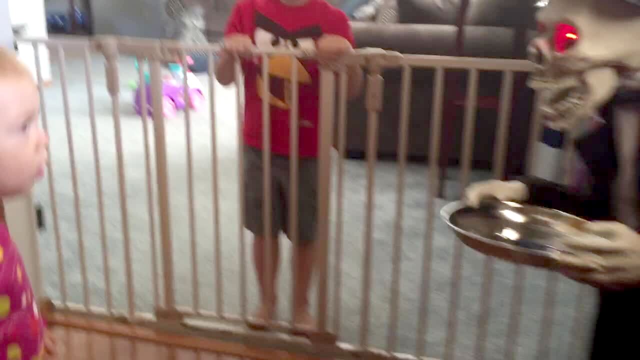 A tot girl and a young boy quickly switch places when they hide behind a blanket in the living room as their family cheers.