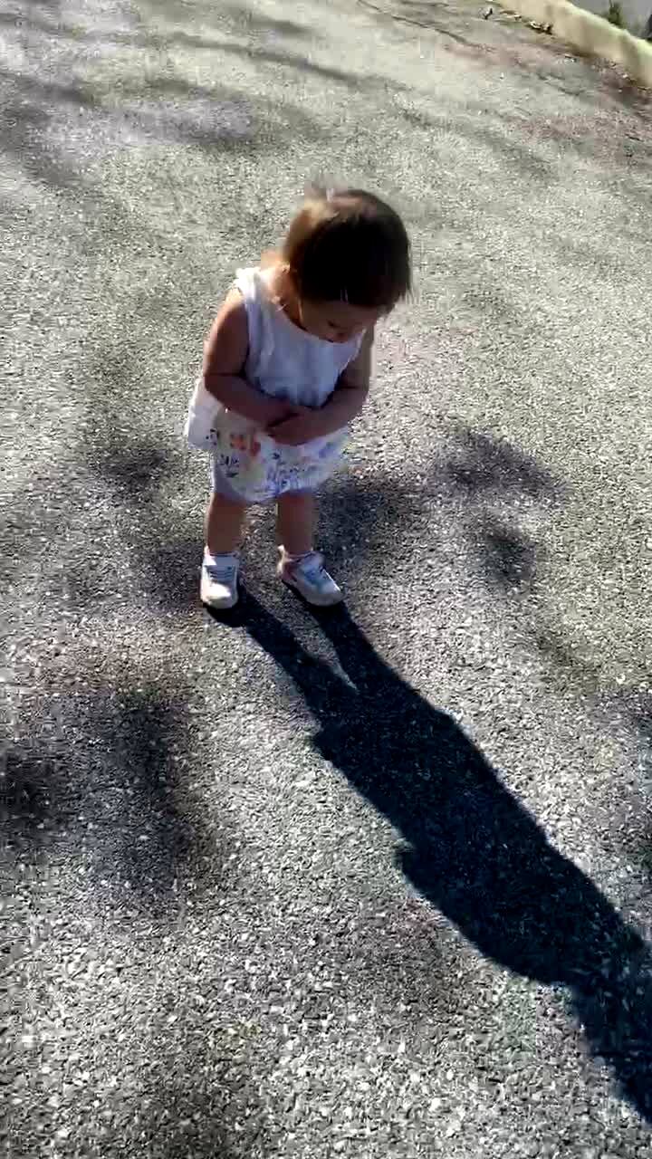 A tot girl says No while she looks at her shadow and she stands in the shade or walks backwards to avoid it.