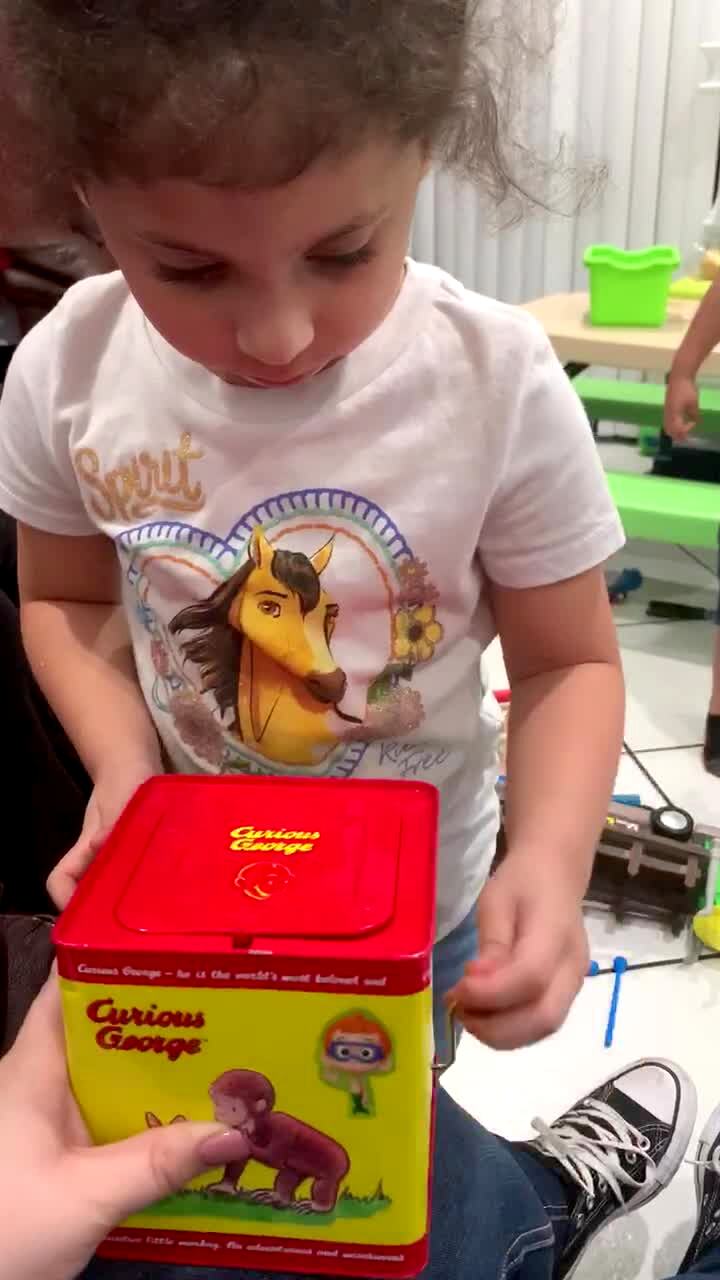 A tot girl cranks a jack in the box until a puppet pops out, then she smacks it repeatedly while she looks scared.