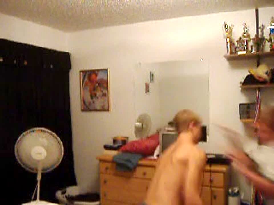 Two teen boys pick up a young boy in a living room by the arms and legs. They swing him back and forth right into the wall. Very jerky camera.
