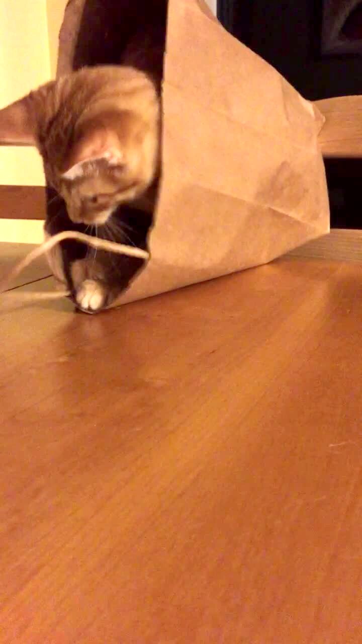 A cat swats at the handle of a paper bag on the dinner table while it lies inside the bag until it falls off of the table when the bag slides off of the edge.