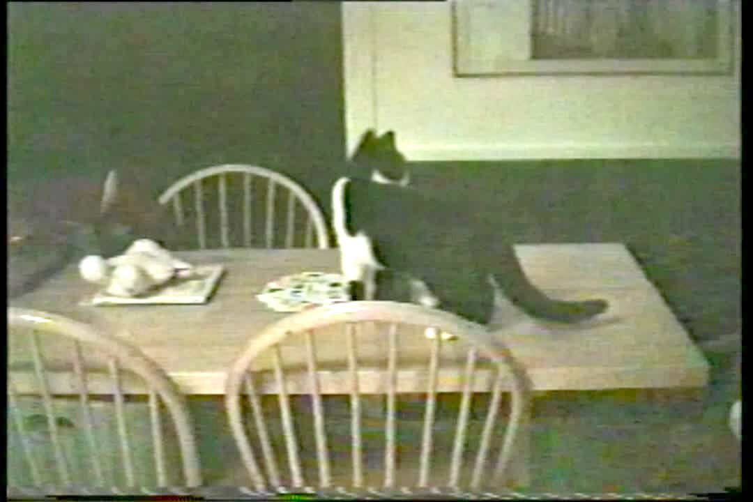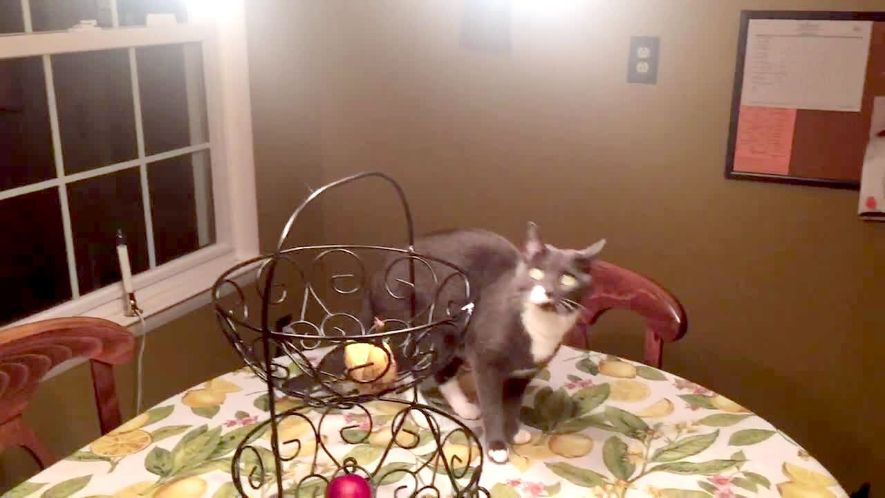 Cat chases moth on dinner table. Cat falls off table and lands on chair.