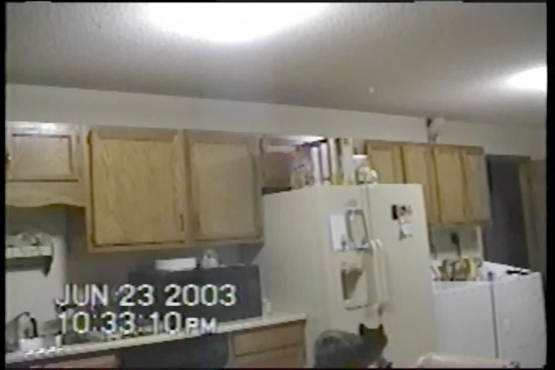 A cat dives from one table to another but misses and crashes onto the kitchen floor instead.