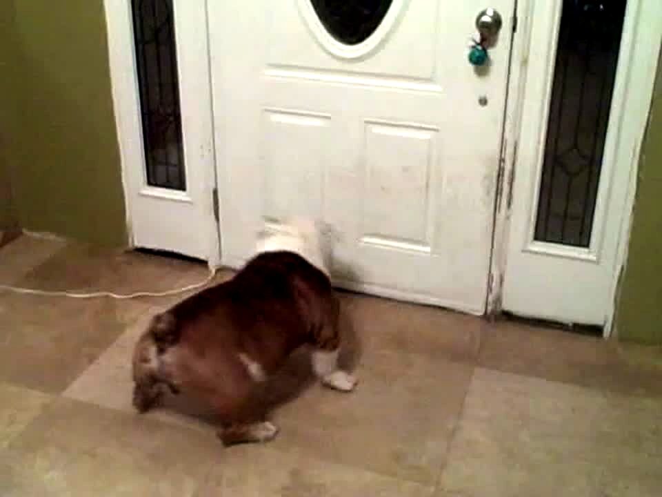A goat ducks a ball that is thrown at him, farts, and collapses and struggles to pick himself up.