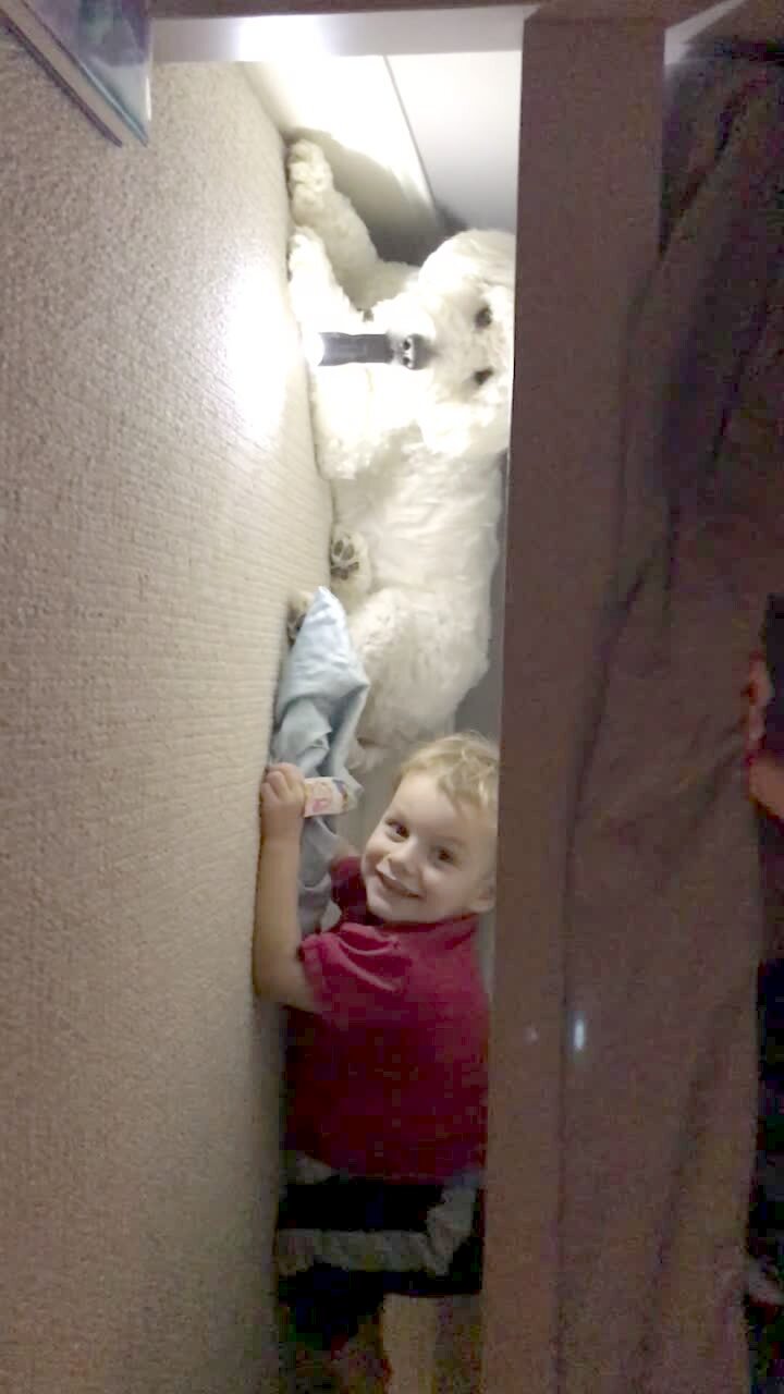 Little boy tries to ride a goat inside a pen, he falls off when the goat throws him into a tub of water. Petting zoo, farm.