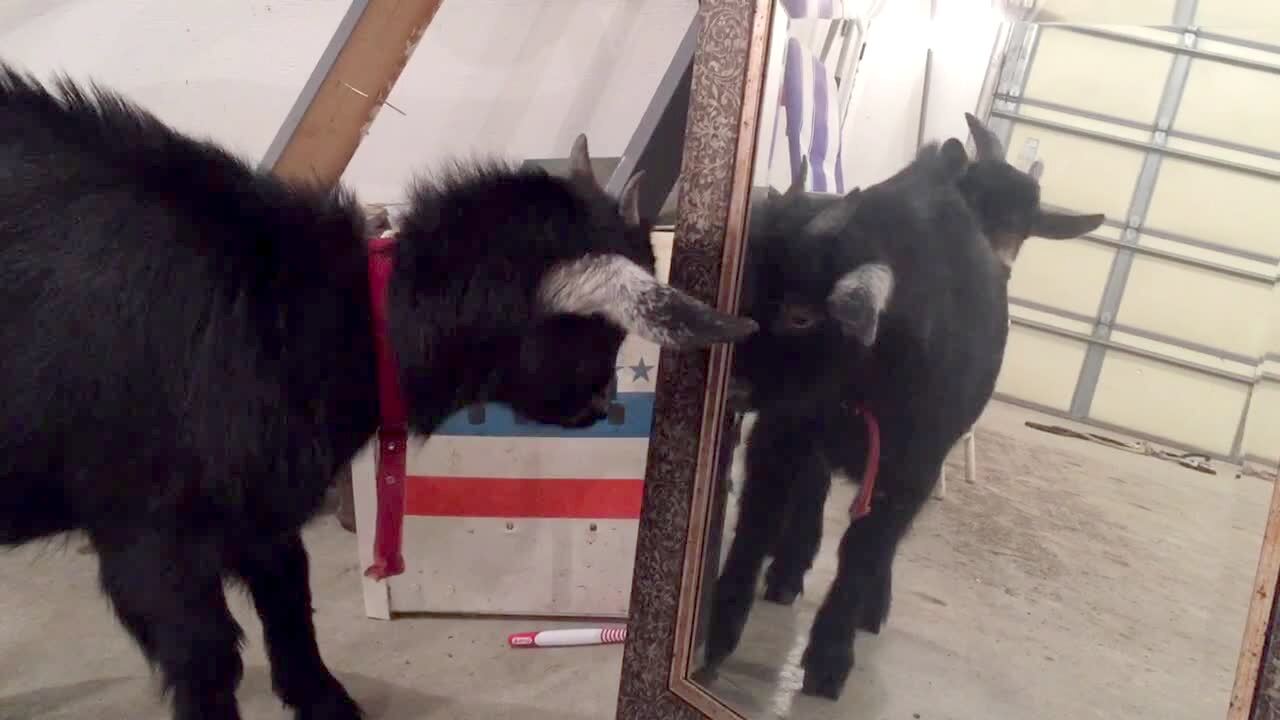 Two goats stare at their reflections in a mirror. One of the goats charges at its reflection which causes the mirror to fall