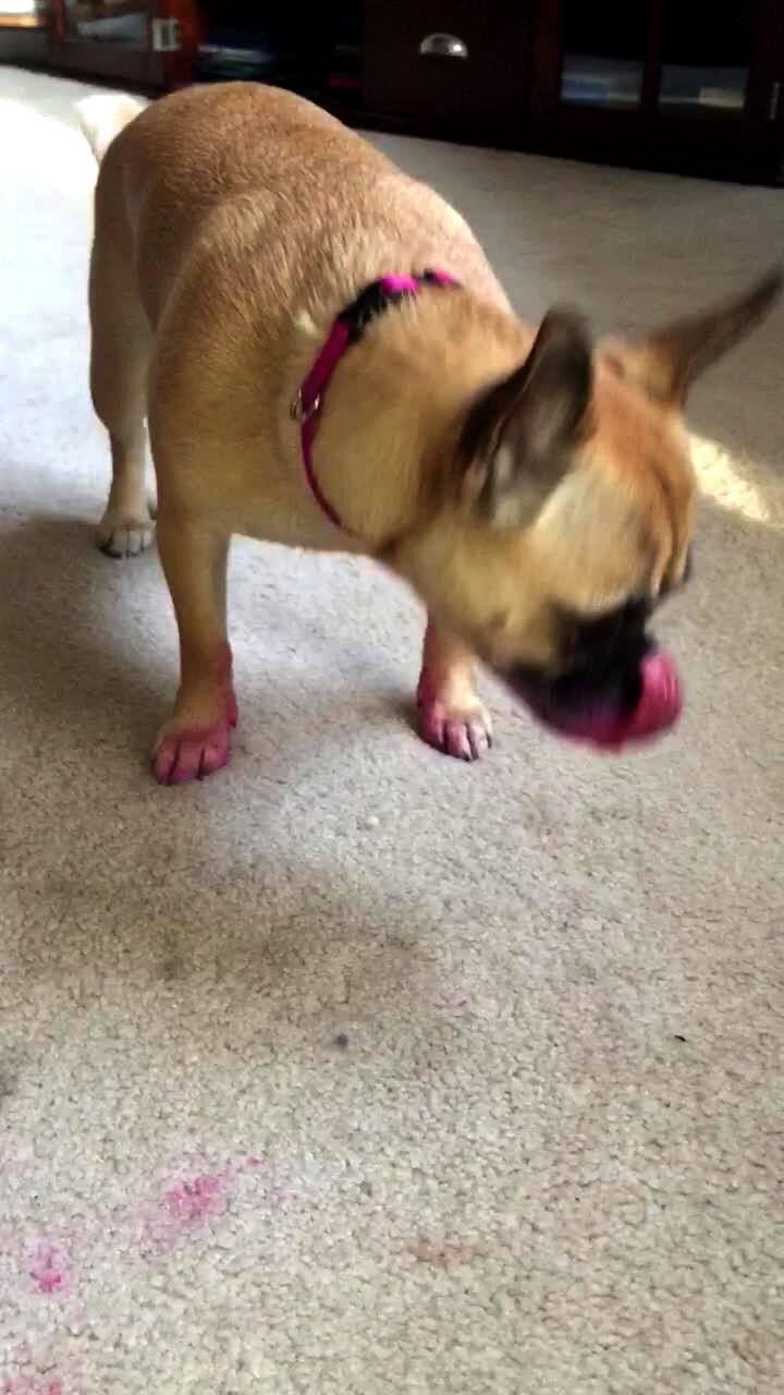 A goat chews on a plastic pole and makes interesting noises.