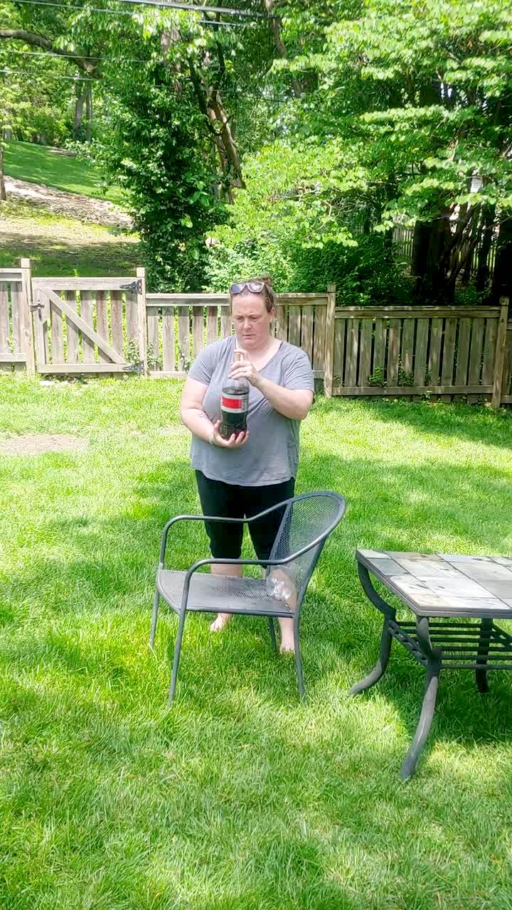 A woman at a farm opens an umbrella and three goats faint.