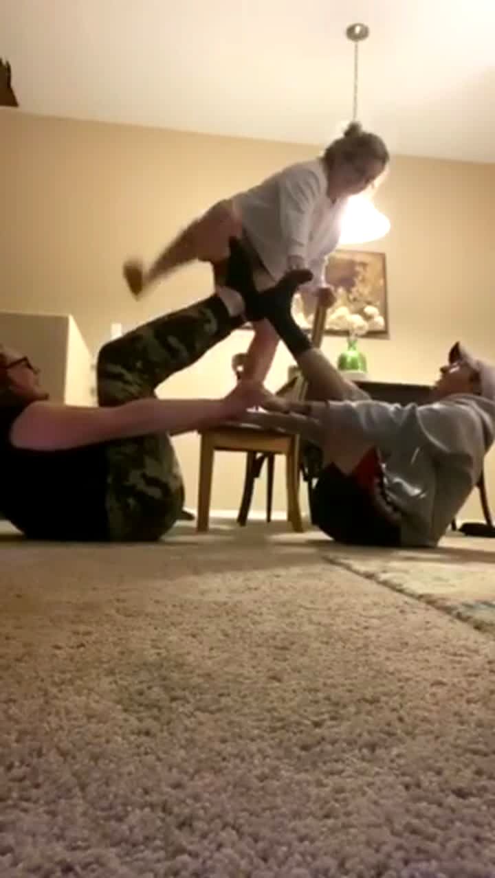 A montage of videos of goats as they faint and fall over in a yard with a woman and two young girls.