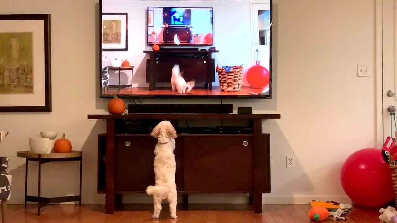 A dog repeatedly jumps in front of a TV in the living room while it watches a video of itself do the same thing on TV. The dog on the TV does the same thing to another video of itself on TV in that video.