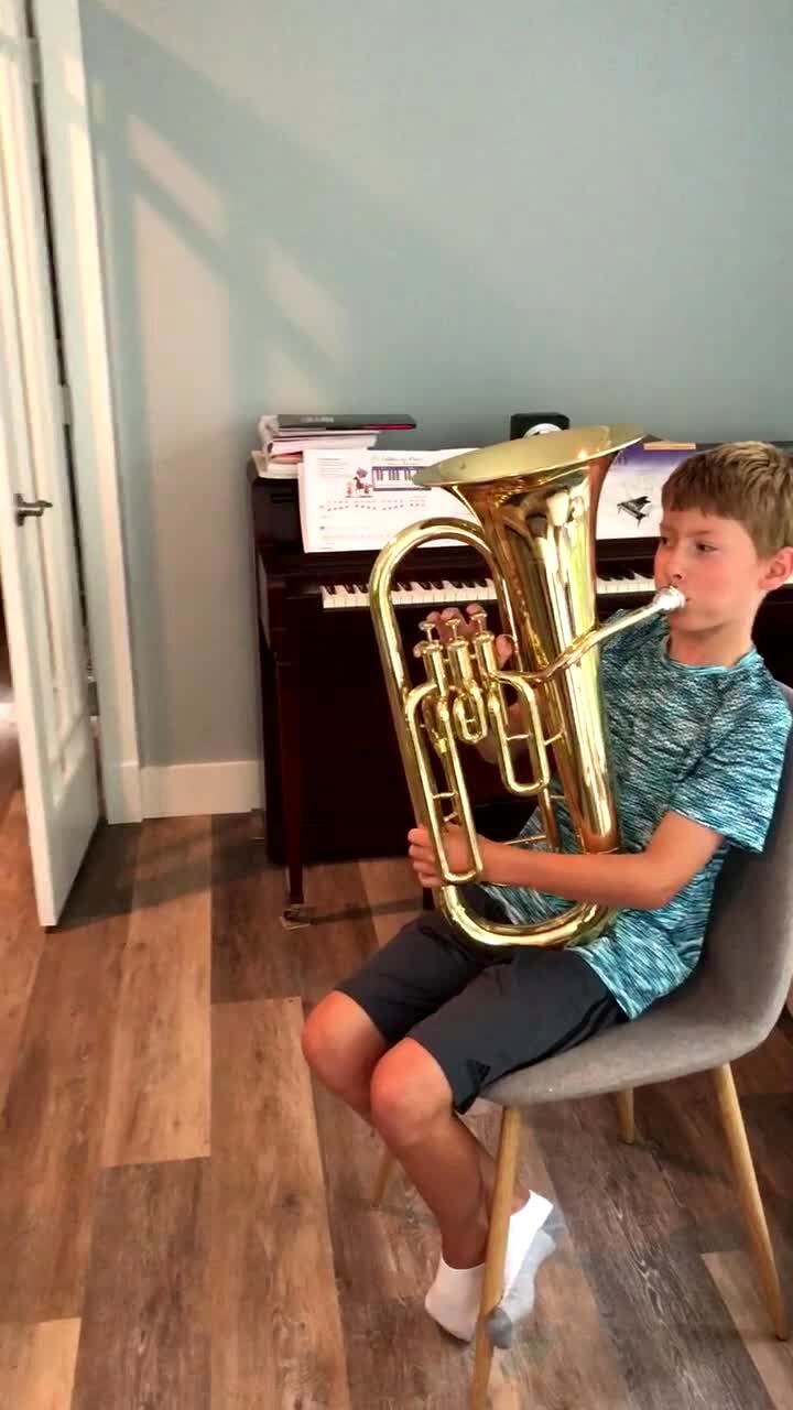 A dog listens to a young boy play the baritone and backs out of the living room.