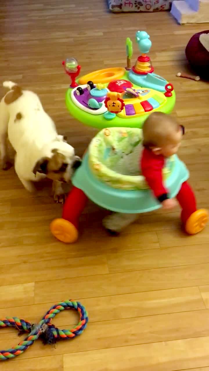 Tot boy has both legs in 1 pant leg and gets pulled around the house by a dog.
