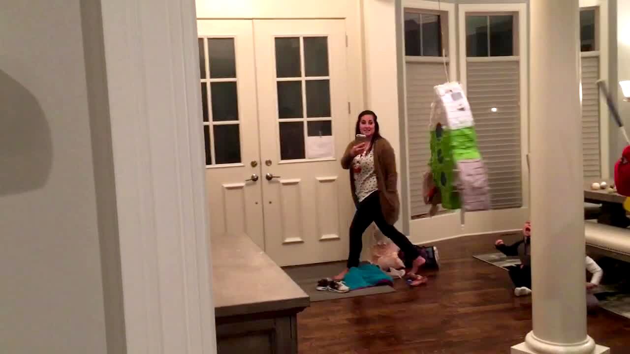 A man hits a pi�ata and slips and falls on a wooden floor.
