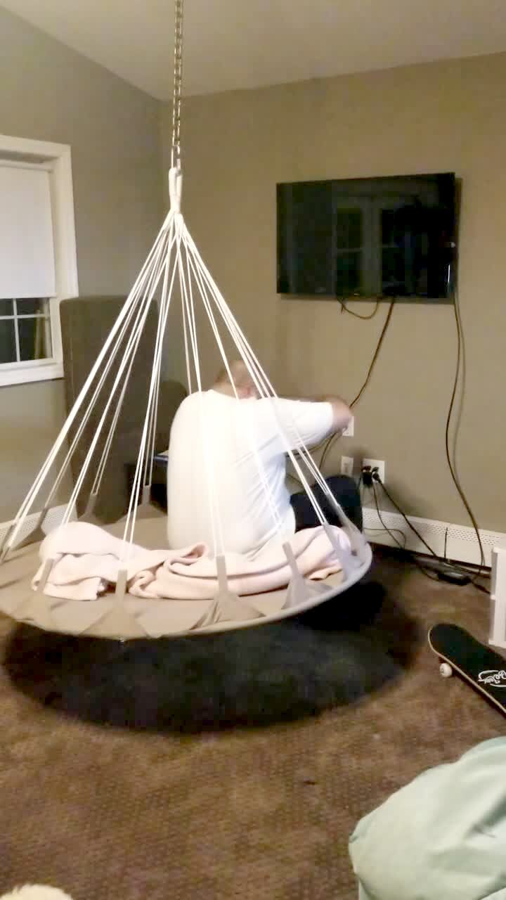 A man tries to sit on a round indoor swing and it breaks from the ceiling and falls down.
