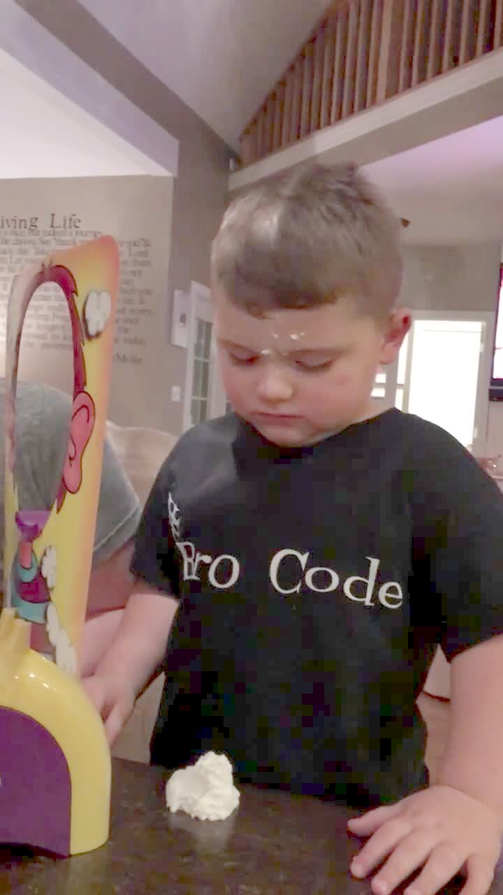 A tot boy does the pie face game in the house, and he backs away quickly when the whipped cream hits him in the face.