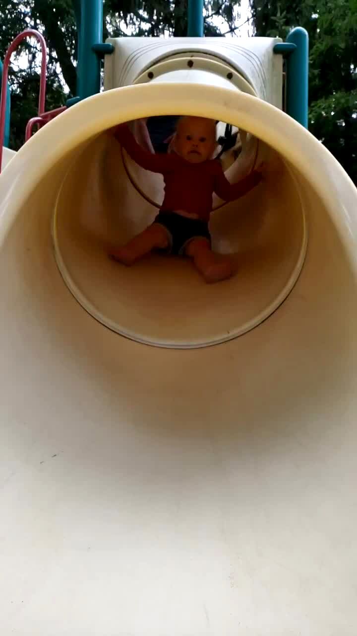 A tot girl opens her eyes wide as she goes down a slide at a playground park. Slow motion.