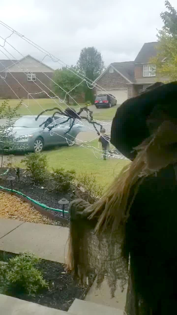 A young girl sees a Halloween decoration by the front door and says "I'm not scared of that witch," then screams when a mechanical spider jumps at her. Security footage.