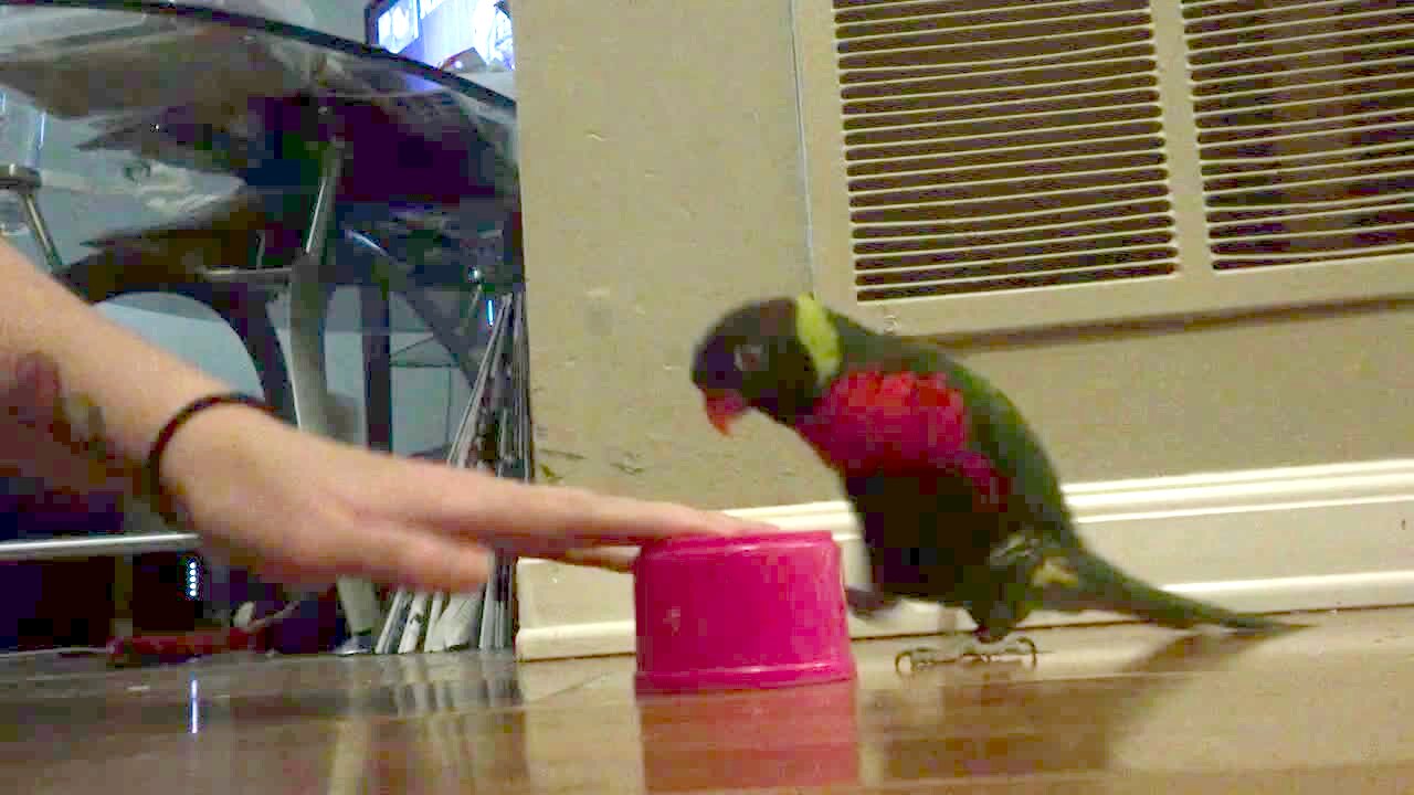 A Lorikeet bird walks back and forth to chase a cup while a woman slides it across the living room floor. Then it takes the cup from the woman and starts to play with it.