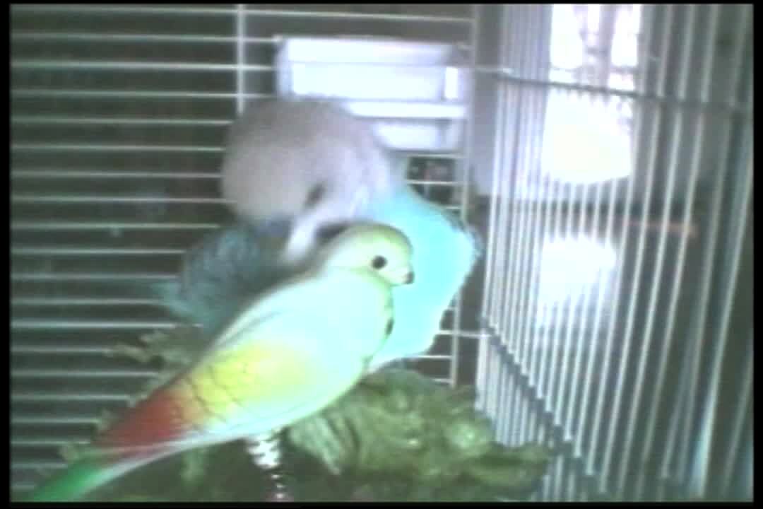A Parrot bird bobs his head and moves his body up and down to the rhythm of a song while he sits on a branch in his cage.