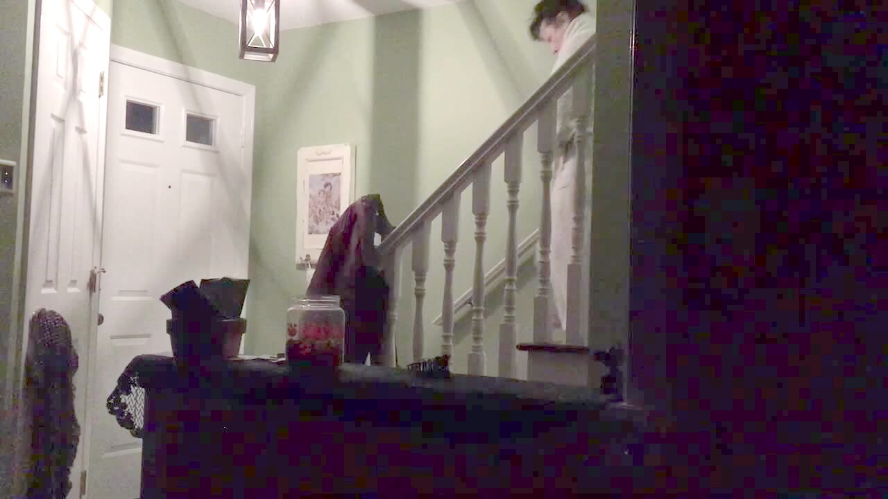 A young boy hides in a ghillie suit and scares a woman and another young boy that walk up to the house.