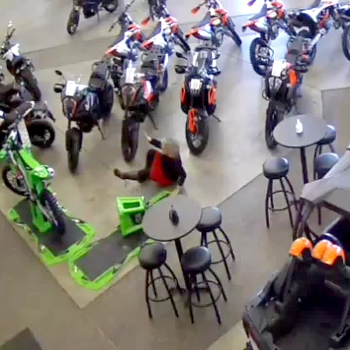 A woman trips on a stool in an auto shop and falls. Security footage. Featured talent cleared only (the woman who trips).