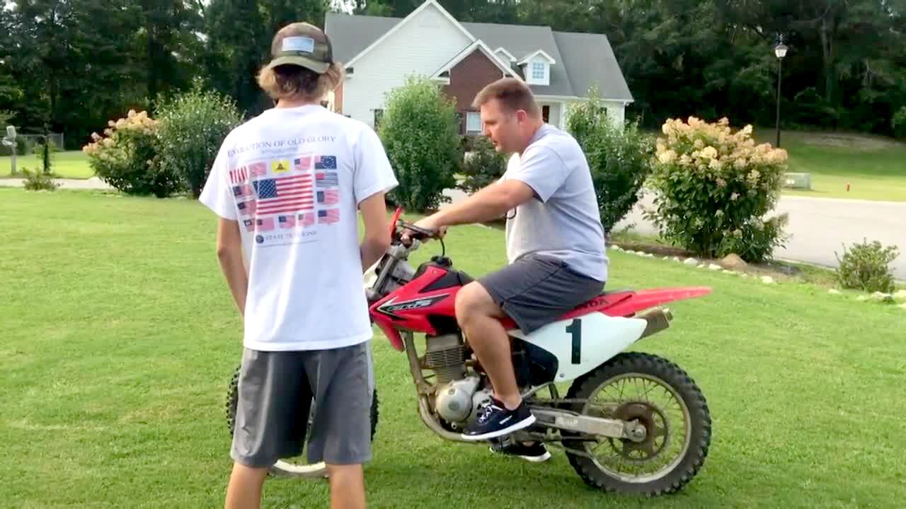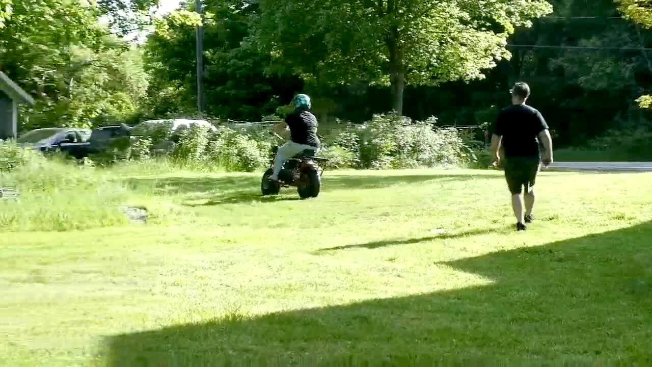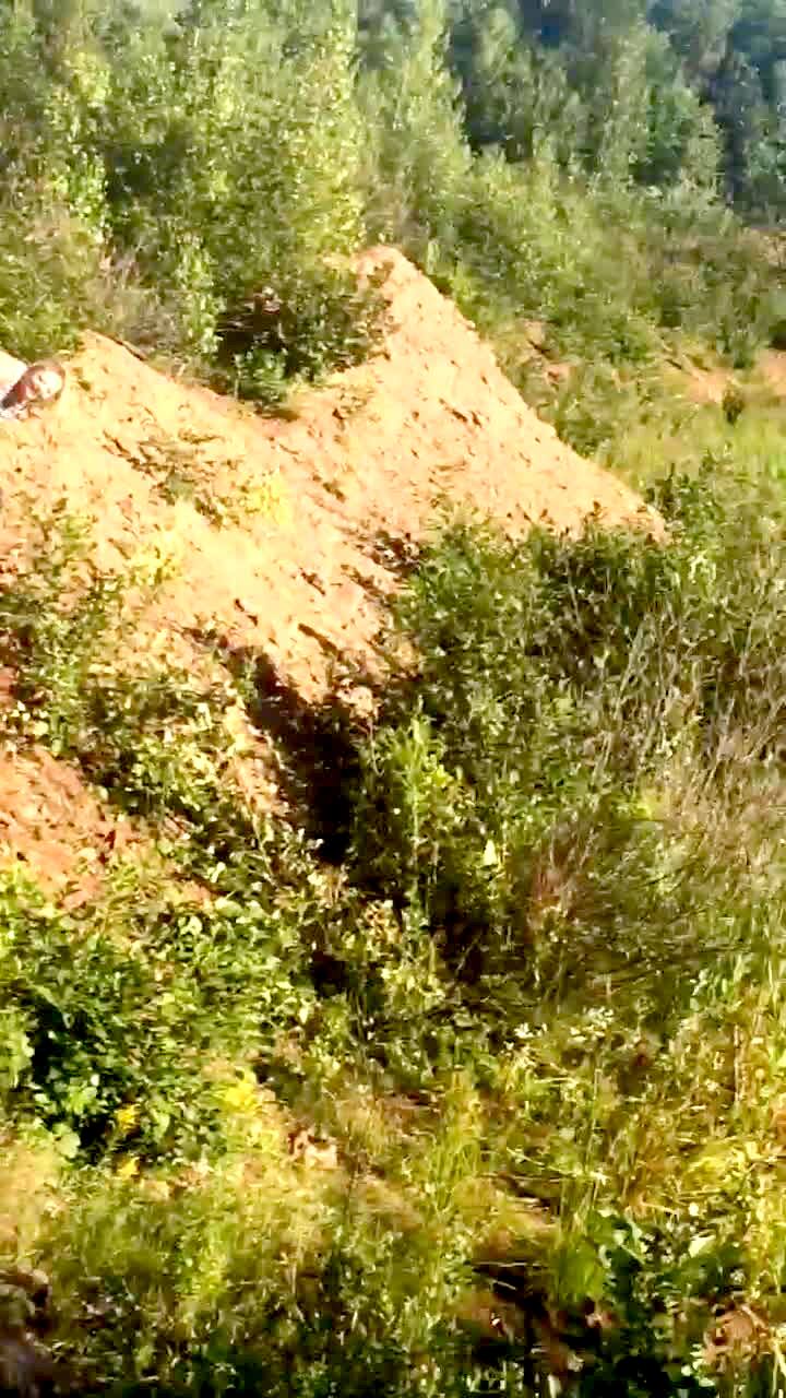 A woman rides a dirt bike in the yard and crashes into a bush. No audio