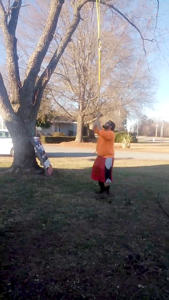 A tree branch falls on top of a man in the yard when he jumps with a rope attached between him and the tree to make it break.