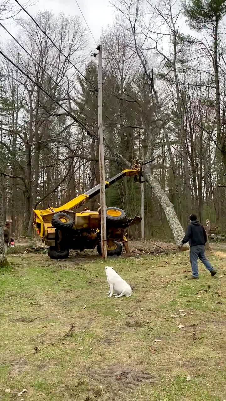 A man cuts down a tree with a chainsaw but as the tree falls, the crane that holds it up falls down with it. Featured talent cleared (no release for the man operating the crane).