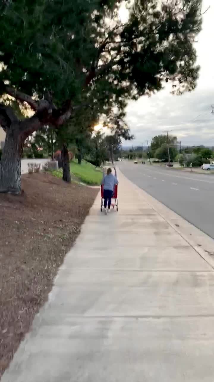 A teen girl pushes her teen sister down a sidewalk in a shopping cart. She drops her phone and turns around for it, and the girl in the cart continues to roll down the sidewalk. The cart tips over and she falls into a street.