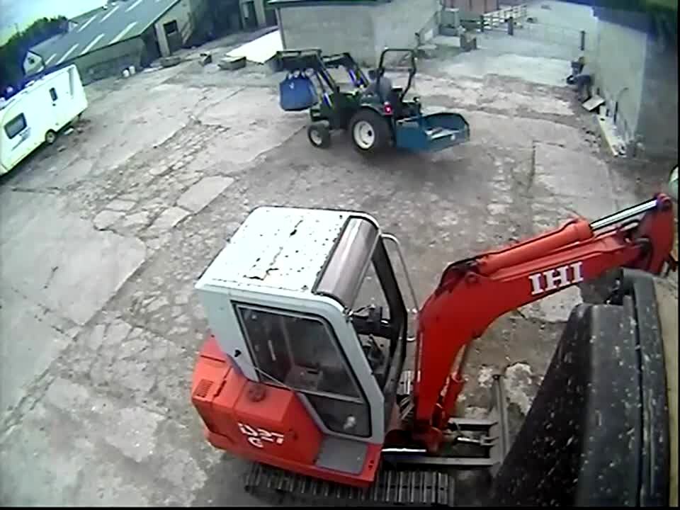A man on a tractor tries to unload his tractor off a trailer. He flips backwards onto the front yard and says, "That's something you watch on TV." before he continues to back up the tractor. Security Footage.