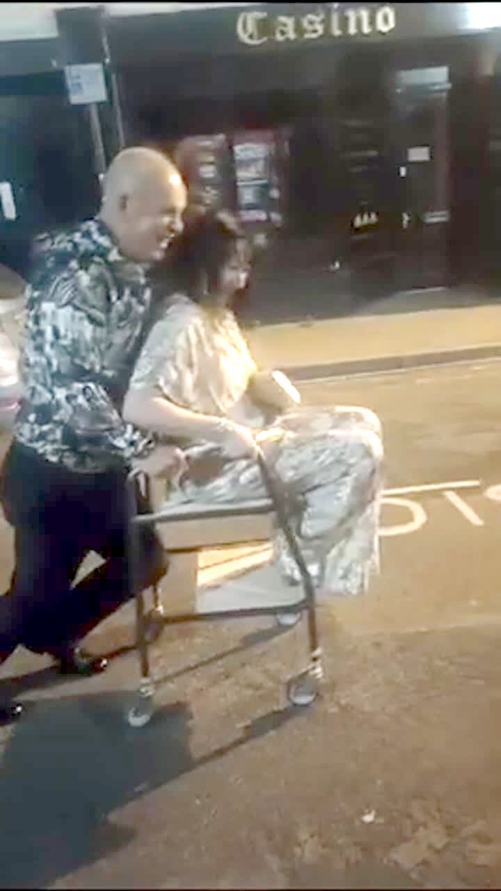 A man runs while he pushes a walker in a parking lot at night. A woman sits on it and the man pushes her. The walker flips over and they both fall down.