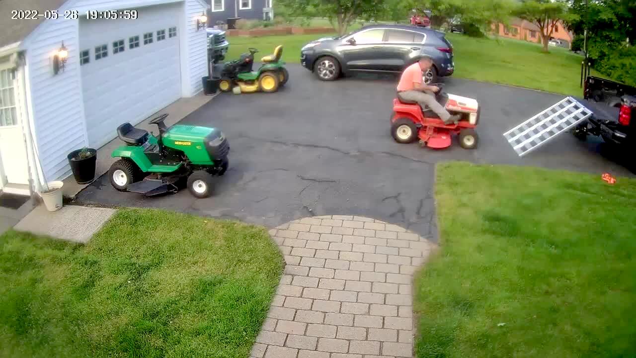 A man drives a lawnmower in the backyard, and bumps into a wall. He steps out of the lawn mower, then it continues to drive away as he chases after it. Home security footage.