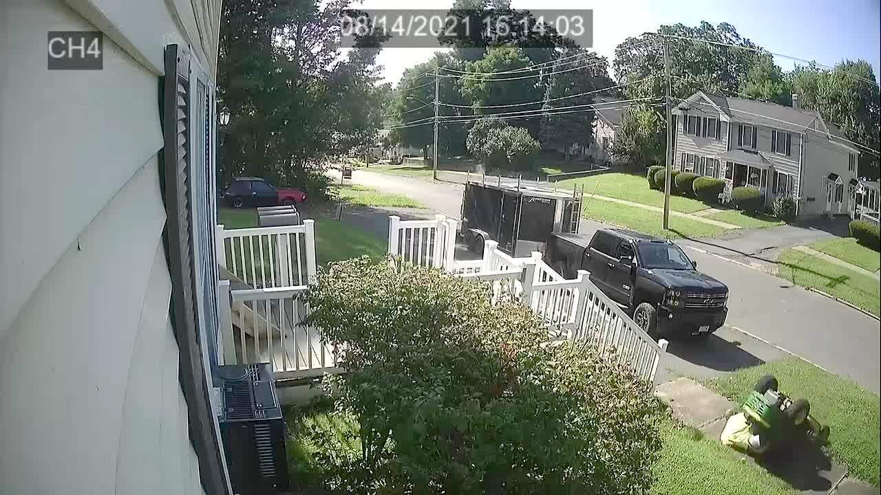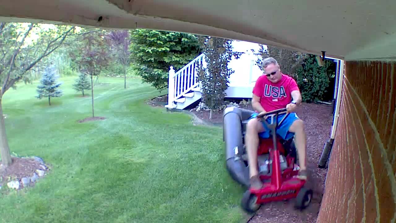 A man uses a ride-on lawn mower up a steep hill in a front yard, and it flips over. Security footage.