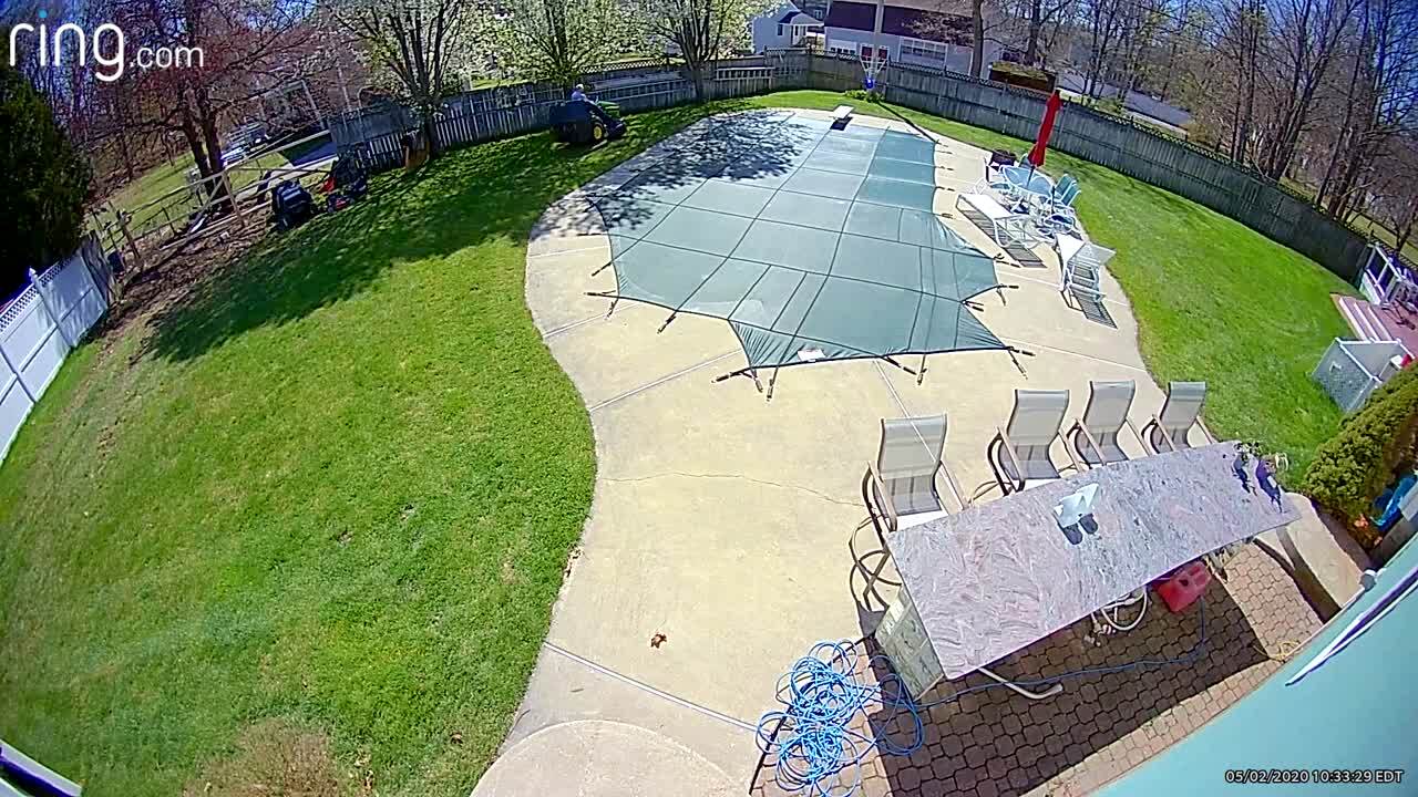 A man drives a lawnmower tractor in the yard. He drives onto a covered pool and falls through into the water. Home security camera