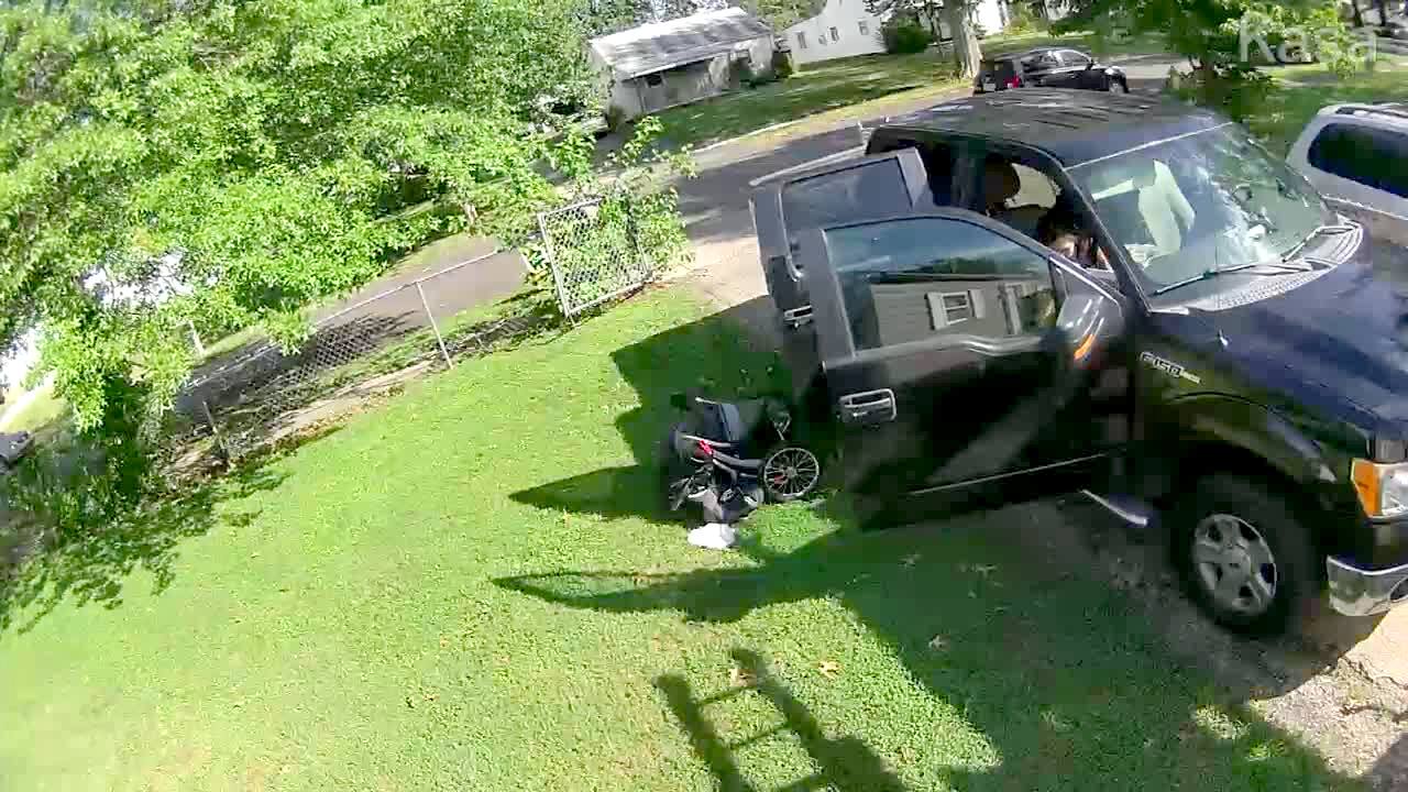 A man trips on his baby's stroller while getting out of the car and falls over. Security footage.