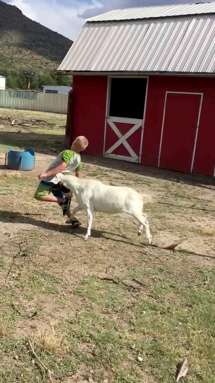 A young boy holds a goat by the neck in a yard, then lets go and when he turns around it headbutts him in the back and he falls.