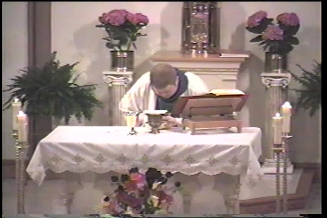 Priest prays during Mass holding up communion. Hear noises, then a boy runs behind priest followed by his mom. Church. Priest says he can't wait to see the video of that.