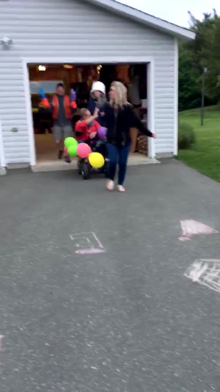 A young girl hides behind in the hallway. She and the other young girl behind the camera run into the kitchen and yell Happy Birthday at a senior man. The senior man jumps up, clutches his heart and says, "What the hell?" The girls laugh and the man walks into the other room to sit down.