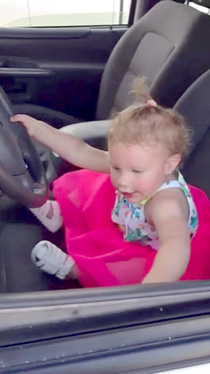 A tot baby girl pretends to drive a parked car in a drivers seat. Her Aunt goes to adjust her seat, the back pops up, and squishes the baby's head against the steering wheel. Her head honks the horn.