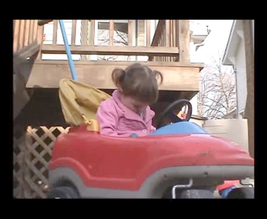 A young girl starts to drive her power wheels toy convertible car that she got as a Christmas present backwards down the sidewalk. Her grandma walks towards her and then the girl suddenly starts to drive forward and crashes into her grandma. The senior woman spreads her legs to let the car go under her, but then the girl hits her head on her grandma's groin and gets stuck there until the car tips back far enough for her to slide through.