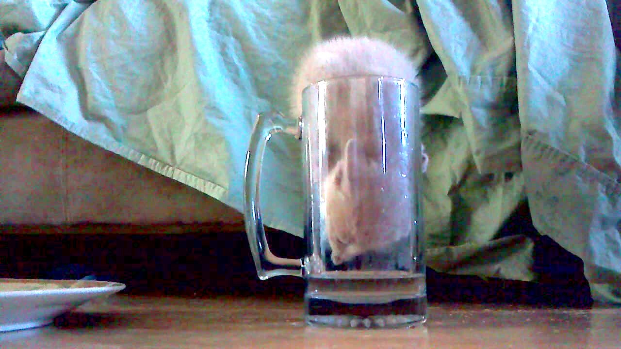 Small brown kitten climbs beer mug/ glass and sticks body in to drink water at the bottom. cute