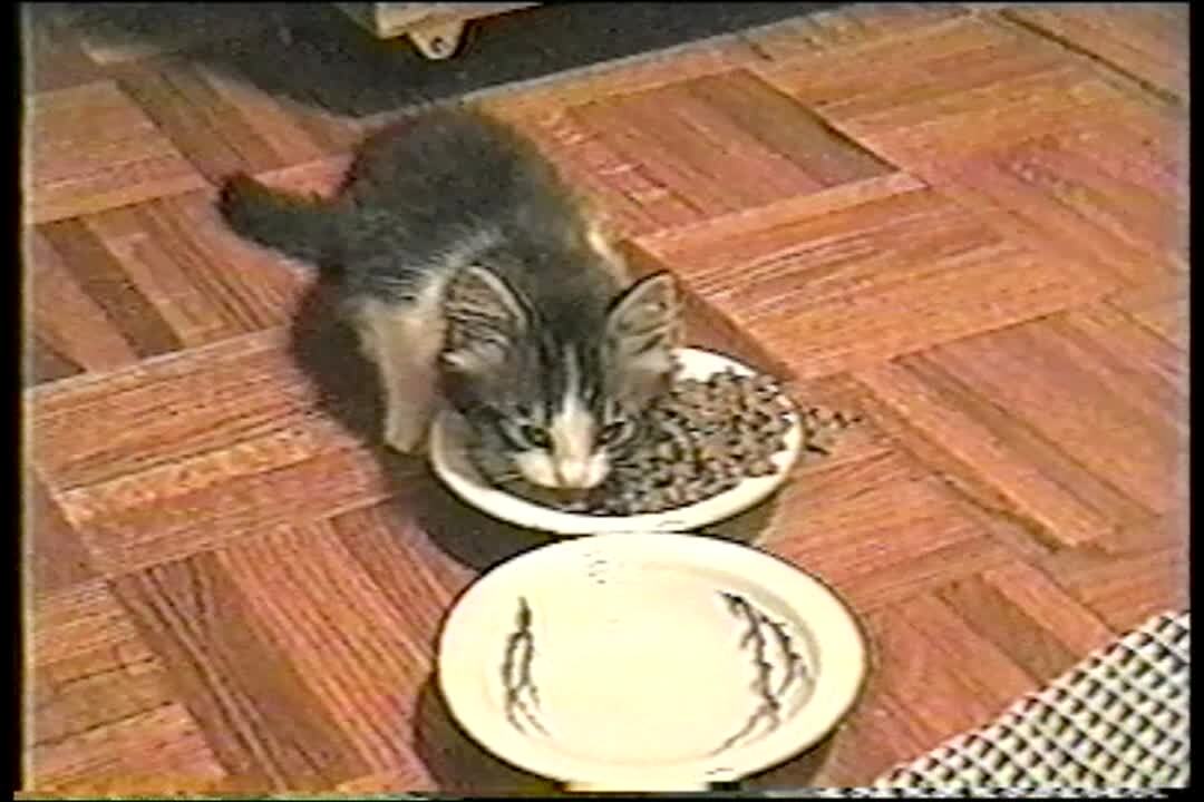Kitten makes funny noises when eating cat food out of a bowl.
