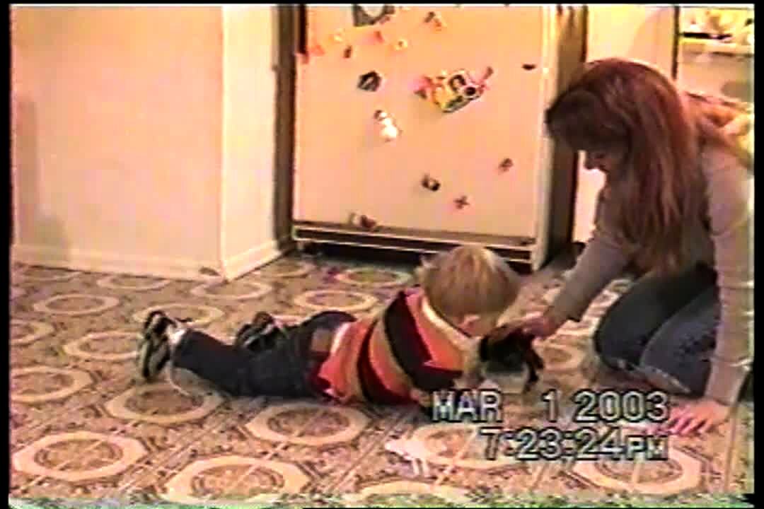Tot boy acts like a kitten and drinks it's milk. He also pushes the kitten away when the kitten wants it. cat