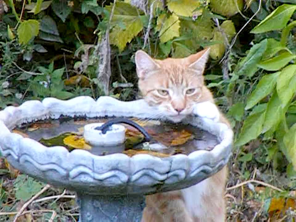 A cat drinks water from a faucet in slow motion.