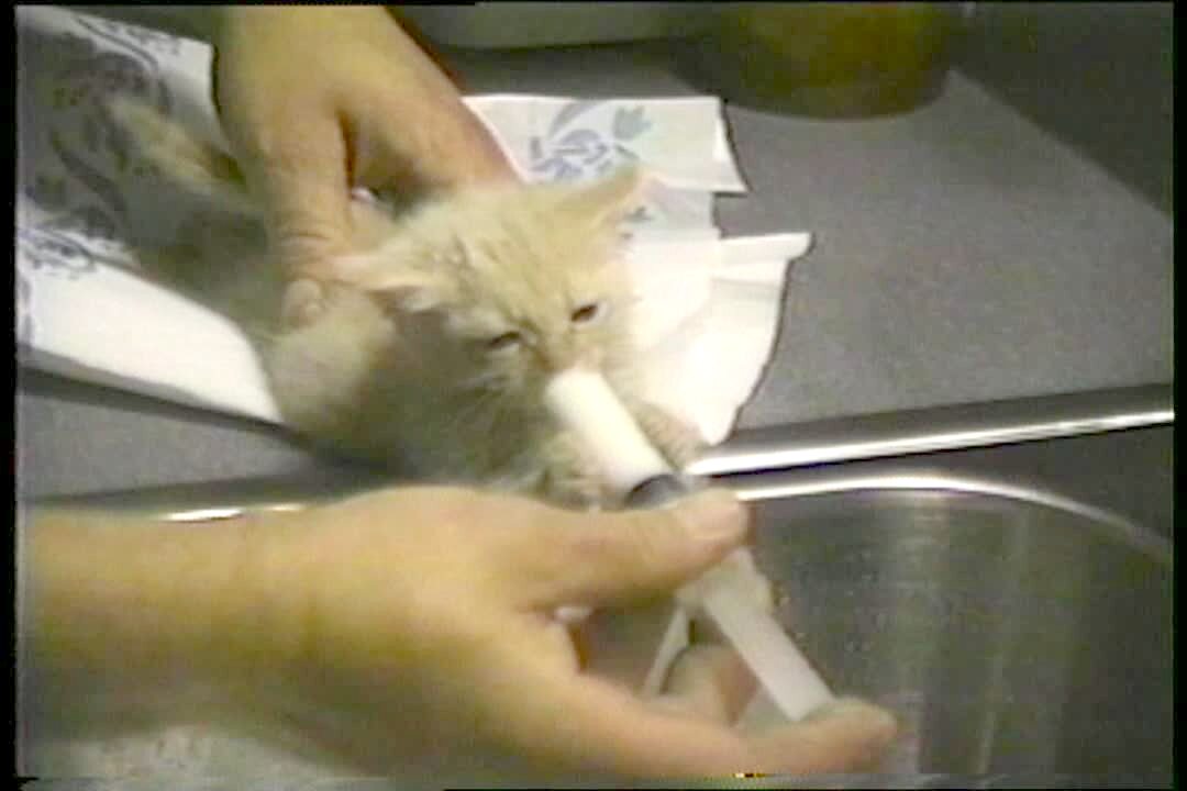 Newborn kitten is fed milk from a syringe. Cat paws rapidly try to grip the bottle but he can't get a grasp. Arms flail.