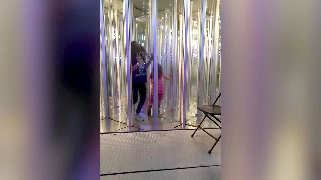 A tot girl sees her mom in a mirror maze and runs to her but crashes into a mirror.