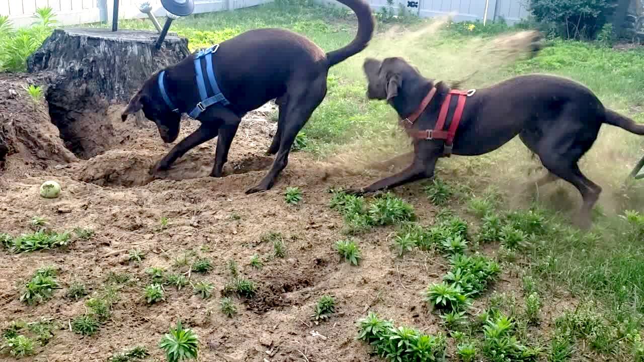 A chocolate Labrador retriever digs a hole in a yard, and another dog eats the dirt that he kicks up.